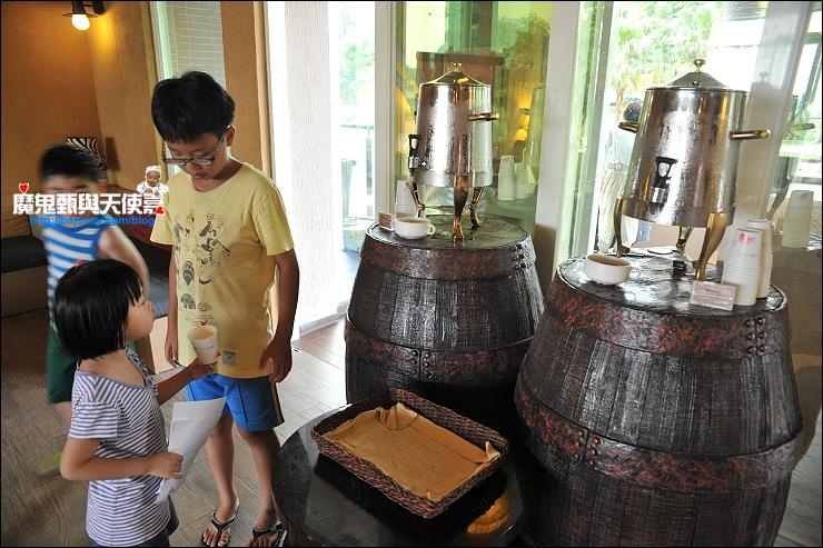 每次來六福莊都是太陽高高掛,停車場的車子全部擠在那幾棵大樹下面,接待大廳一進門的自助關西仙草茶和關西紅茶是在地特產,超冰超讚,充份發揮讓遊客瞬間降溫的作用,涼啊涼啊涼~不少剛剛check in的房客,直接坐在門口喝涼順便欣賞15:00~15:20的非洲迎賓舞,晚上17:30和隔天早上11:00各還有一場,舞者會與來賓互動,活潑又熱鬧,表演結束還有大合照時間。