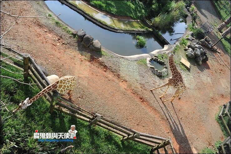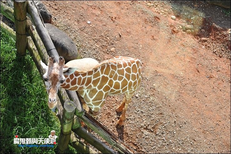 住房區前的動物生態景觀區現共有七種動物(長頸鹿、白犀牛、四角羊、環尾狐猴、斑馬、紅鶴、蘇卡達陸龜),除了夜晚能見度差,動物們也都去洗睡睡去了,白天只要陽光一出來,就能看到他們的身影,一天餵食兩次,上下午各一次,餵食口都故意設計在離遊客很近的地方,方便大家近距離觀賞。上次來有參加免費的館內動物介紹活動,每天13:15~13:30/16:00~16:15/17:00~17:15在觀景平台,聽說長頸鹿一整天都在吃,他們的警覺心很強,在野外生活的長頸鹿連睡覺也採站姿,這裡餵食的是富含水份的桑葉,所以沒有另外給水喝。