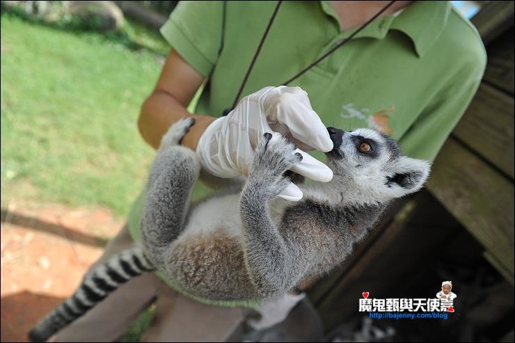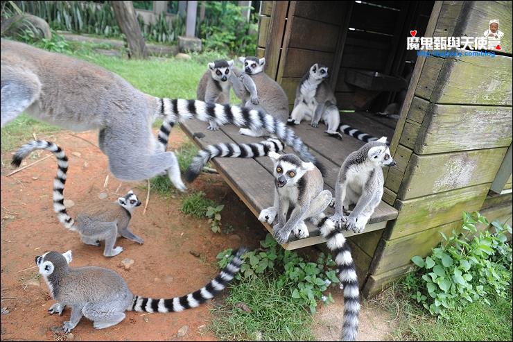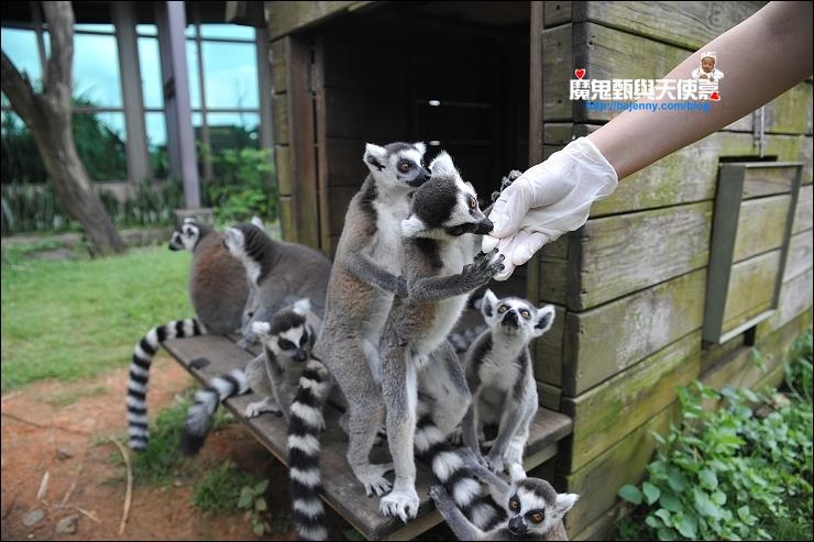 上次來六福莊,我們參加了兩場環尾狐猴互動體驗,聽說現在狐猴區又多了害羞的狐獴(不容易見到!!),這可是來自馬達加斯加島的狐猴,由於狐猴食量有限,體驗採總量管制,參加人數會有名額限制,第一場是餵香蕉,但當時下起雨來,又要戴牛仔帽、口罩跟手套,還要穿雨衣、雨鞋,搞得有點狠狽,好不容易涉水過去一趟,結果他們都跑去躲雨了,小屋裡根本沒幾隻猴,有點敗興而歸...於是乎,隔天一早我們又參加一場環尾狐猴的互動體驗,這次改餵葡萄乾,超刺激的!相對香蕉,聽說他們更愛吃這個,因為很甜,不過由於葡萄乾面積很小,烏龜哥哥特別叫我們要抓緊藏好葡萄乾,一點一點慢慢露給他們舔,不然一口被叨走,就不用餵了啦...他們真的無法抵擋葡萄乾的魅力,一個一個爭先恐後,還會整個手抓腳繞環在手上,餵食活動真的很有趣!連一向小膽的允嘉哥也敢嘗試,反而是大膽妹躲在一旁...可以趁他們在吃的時候,偷偷摸他們的頭或身體,應該也只有這個時候會乖乖讓你摸,之後就會來去無蹤,讓你抓不到也摸不到...