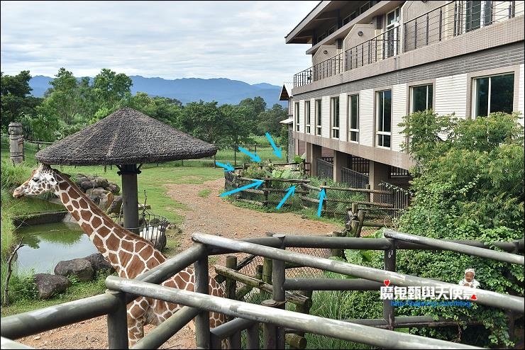 長頸鹿館下面就是動物進出的籠舍,圍籬比較多,斑馬館下午會西曬,據說長頸鹿舔窗叫起床號的機率比較高,但一切的一切還是要看運氣,這裡有網友錄到的長頸鹿舔窗morning call動畫→ https://goo.gl/UD5ger。