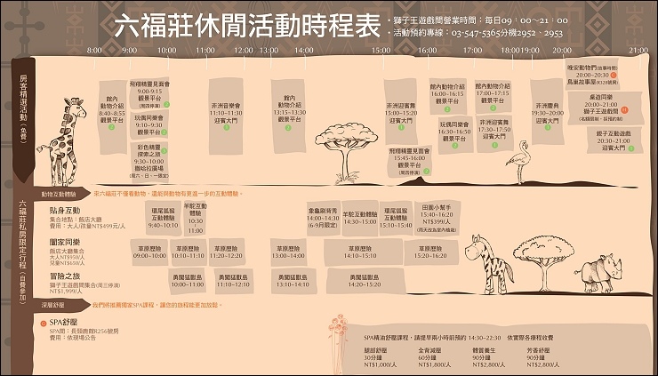 飯店服務人員的態度非常親切,check in時會發給一張私房休閒活動時程表,分成館內私房活動、私房景點和非洲主題表演,這裡有難得可以親近動物的活動,如草原歷險/象龜刷背秀/羊駝互動體驗/環尾狐猴互動體驗/勇闖猛獸島等都可以近距離與動物互動,這個真的很難得,比看動物關在籠子裡子太多,全台灣應該就六福莊可以提供這種育教於樂的動物保育互動體驗,因為有人數時間限制和費用,有興趣有預算的朋友建議提早預約安排,小朋友應該都會很開心,然後瘦了爸媽的荷包...