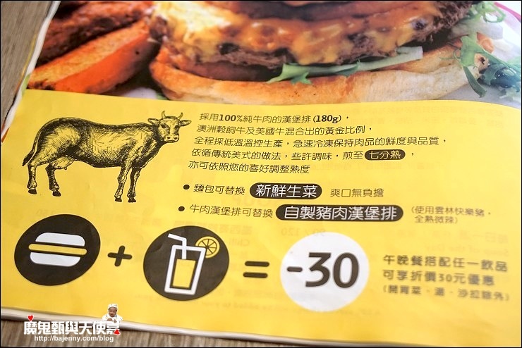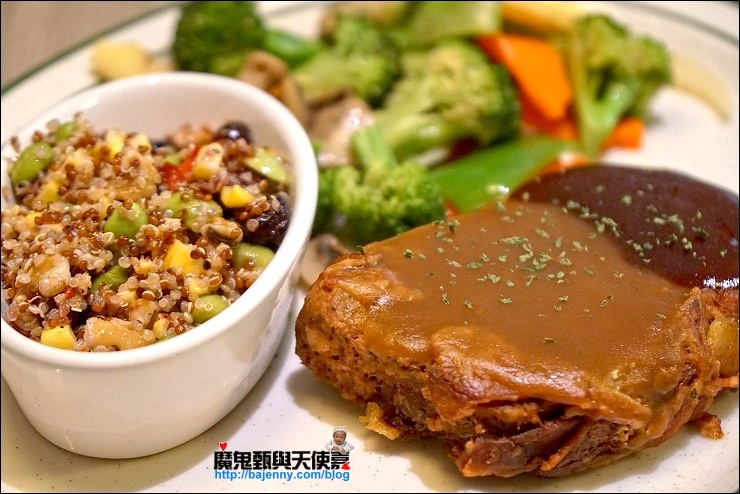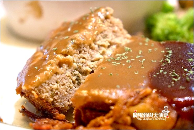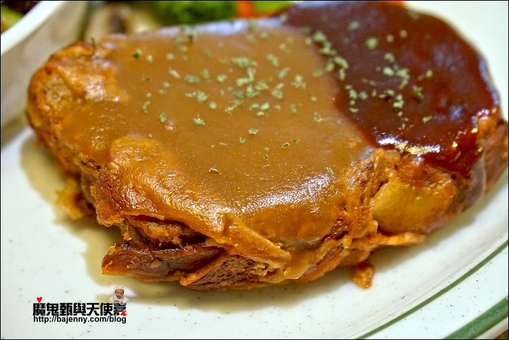 美式BBQ烤絞肉排,聽說這是美國媽媽的家常菜喔,為牛豬絞肉雙拼,上面淋了牛肉醬汁跟BBQ醬汁,搭起來還蠻順的,有些絞肉排我吃起來會怕,這個不會,瑪格說好香。