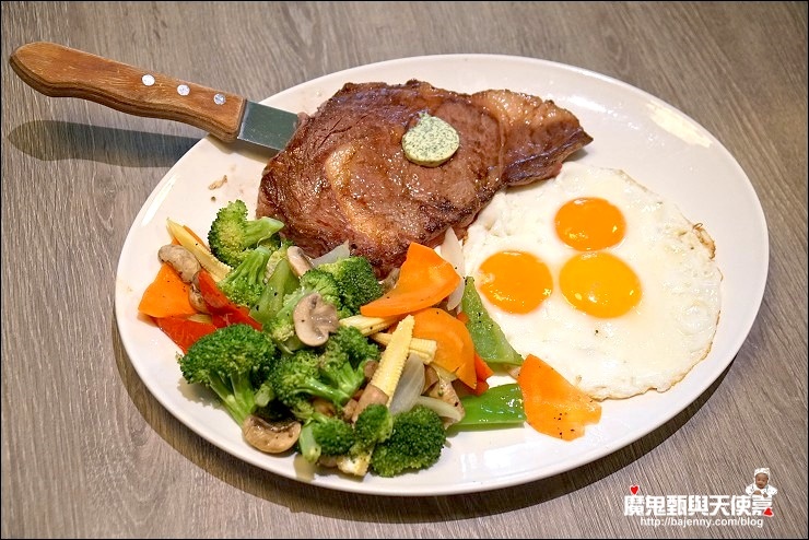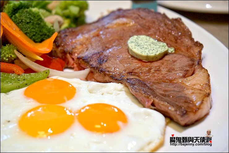 我們把菜單上有肉的全都點來嘗嘗,主菜都可以選兩樣side dish,第一次見到一次給三顆蛋的,肋眼牛排絕對是我們這種愛吃不怕肥的心頭好,牛肉就是要夠油才好吃嘛(請低頭捏捏自己的肥肉XD)!因為大家一起share沒辦法多吃,總要保留點形象,不要嚇到第一次見面的人...