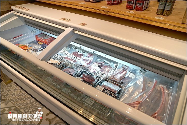 既然名為肉舖,顧名思義就是買肉的地方,店裡有七個半開式大冰櫃,每一個都有作區別規劃,分別是穆斯林專區、穀飼肉、草飼肉、特價專區、燉煮區、方便即食區、海鮮等,像中間靠左的這個冰櫃是特價專區,要減價促銷的商品就會擺到這裡,想趁機撿便宜的勤巡這櫃就對了!瞧這戰斧牛排是不是有夠大隻,料理這個不但需要技術還要烤箱夠大才塞得進去XD