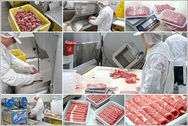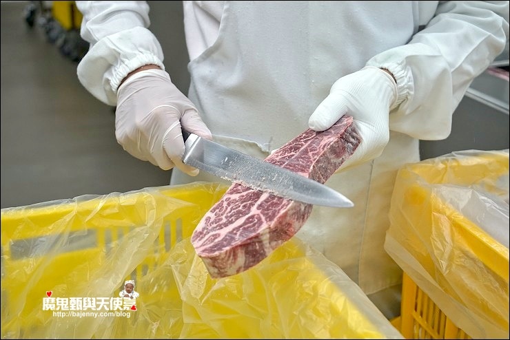 全室採德國無縫地板來降低細菌的滋生,安裝環保無汞LED燈,管線密閉,利用紫外線燈管殺菌,並以太陽管取代傳統風扇,保持溫度恆溫,當場看作業人員操作機器切骨削肉都捏了把冷汗,真的要很小心謹慎啊,這非但關乎自己的人身安全,分切的好壞也大大影響肉的經濟價值,所以聽說某些key person有特別加給,而且這次才知道原來剛切下來的肉色澤呈現暗紅黑色,這是肉品在缺氧狀態下具有的正常自然色澤,跟氧氣接觸後慢慢會變鮮紅色,再變略帶棕色。