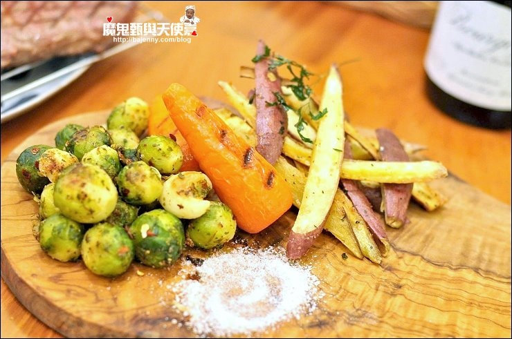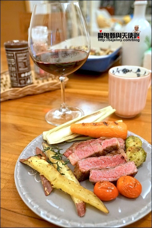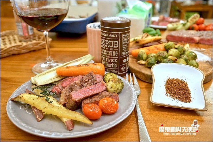 我還是專攻我的青菜就好XD,烤紅蘿蔔、玉米筍、地瓜、孢子甘藍、風乾蕃茄等拿來佐牛肉好搭欸,牛肉沾點海鹽、玫瑰鹽或是香料鹽滋味都不同,平常我沾點海鹽就覺得很美味了,這天姐妹拿出這瓶美國的咖啡調味粉TRADER JOE'S(美金賣1.99,台灣一瓶賣150元),完全擊中我,有咖啡香又帶點甜味,整個提味轉換肉的香氣,愛極了(大推)!