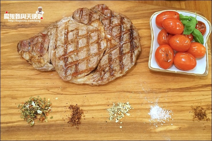 這次還準備了義大利辣粉、咖啡鹽、21種調味粉、玫瑰鹽、烤雞粉來test,無論怎麼沾姐妹還是鍾愛玫瑰鹽,我倒是覺得義大利辣粉跟咖啡鹽都不錯!美國頂級肋眼牛排雖然份量比較小,但肉質鮮嫩度沒話說,還是肋眼稱雄啊~~