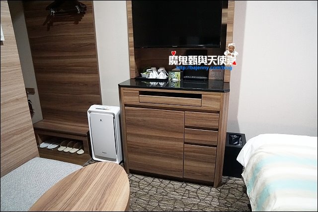 房間真的不大,室內設計空間利用的很好,一進門左邊可以吊衣服,另外有做個檯面,小朋友可以坐在這上面自己穿脫鞋,我們也拿來放東西,底下挖空可以放鞋子。茶包杯子快煮壺跟小鏡子都放在桌面上。