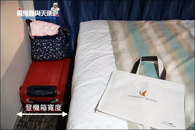 床尾跟牆的距離剛好可以塞進一個登機箱,不過這樣也不好打開就是,走道完全開不了28吋大行李,我得佔用到沙發那邊的空位,大行李攤開後在房裡很難隨便走動。。對了,另外還有提供一個白色提袋,是不可以帶走的哦。