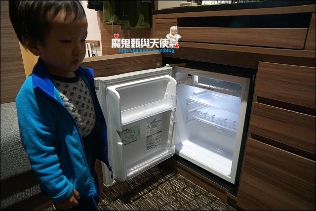 電視櫃下方則是冰箱與抽屜,小阿弟的身高很方便開冰箱,要拿什麼飲料叫他就好。