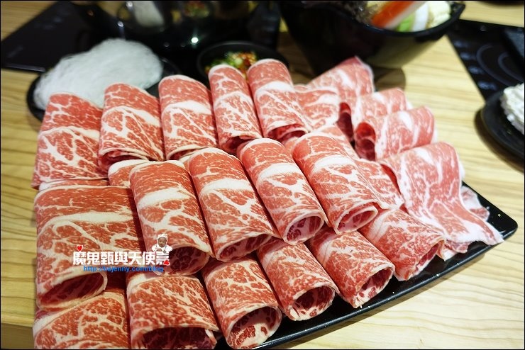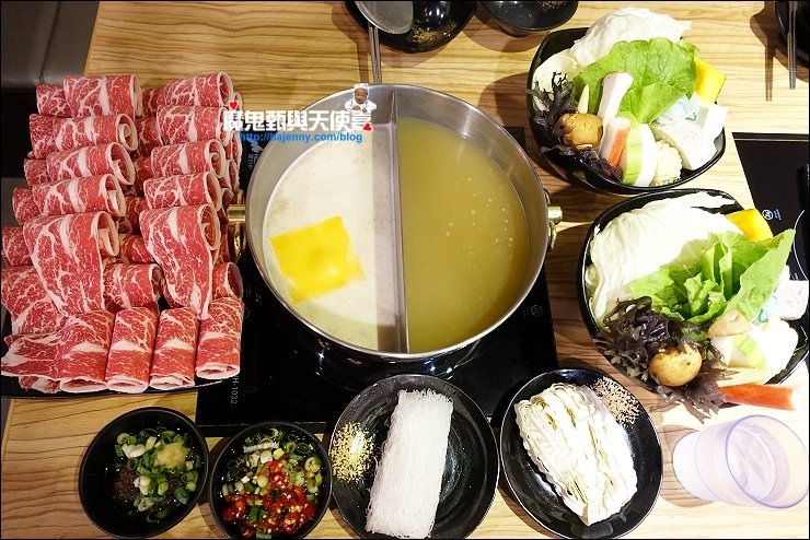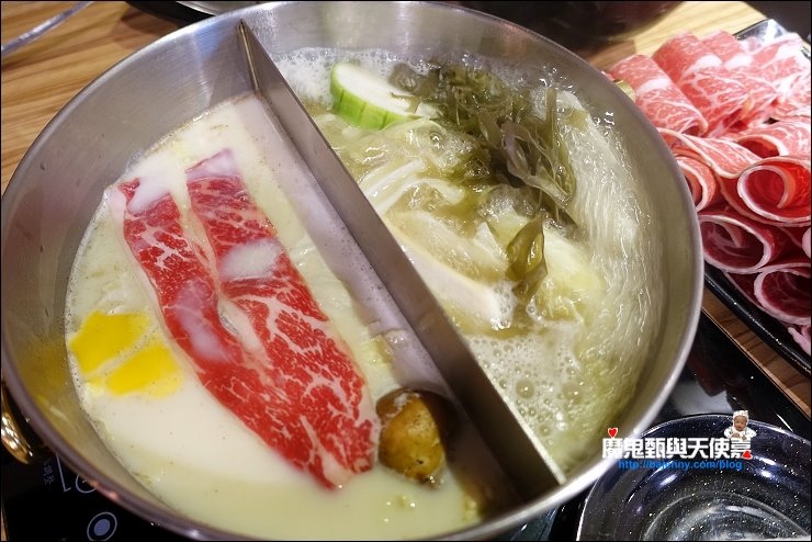 牛奶湯底跟白甘蔗湯,雙重享受。老實說以前我不太愛那種又濃又奶的湯底,吃沒多少容易膩,然後以前到台北金鍋盃點牛奶鍋印象中也很奶,我後來都往隔壁的白甘蔗湯底去煮。這回板橋金鍋盃的牛奶鍋香而淡,完全不會有太濃的甜膩,超適合煮肉跟菜盤的,食物整個鮮甜大加分,後來加湯之後,其實湯沒有很乳白色,感覺跟白甘蔗湯底差不多,但湯喝起來就是有奶香及清甜。
