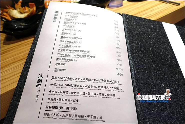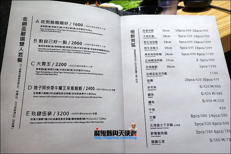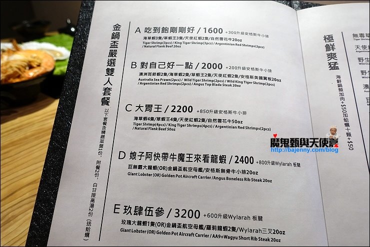 金鍋盃嚴選雙人套餐1600起跳,上看3200的大套餐,隔壁頁的極鮮爽猛是多為不同品種的蝦子或魚等海鮮類,價格不低。