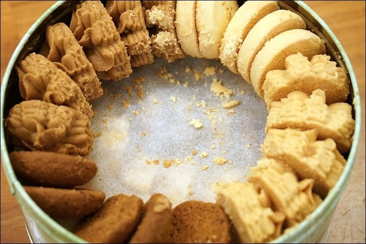 大小鐵盒一樣大小,只在高度不一樣,照片中的是4mix大盒,餅乾分置兩層,共四種口味:牛油花/咖啡花/脆牛油/提子燕麥,剛好兩種顏色,兩兩對比其實很好辨認誰是誰。