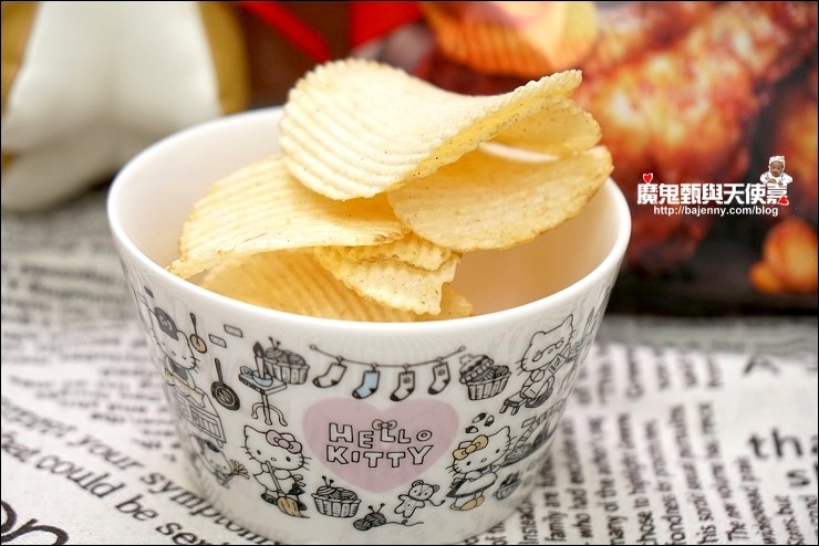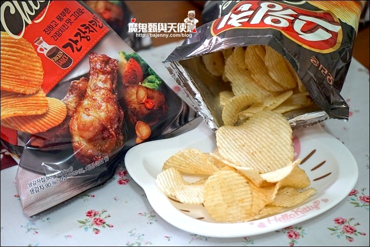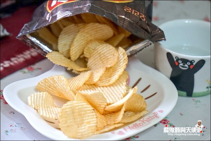 這款韓國ORION洋芋片(醬油炸雞口味)微鹹中帶點醬油甜味,加上波浪形厚片酥脆口感,忍不住一片接一片!小姑說有點像加強版的雞汁口味,又有點烤肉醬的味道,很唰嘴就是,允嘉哥下課回來啃了幾片說爆好吃的!有沒有這麼誇張啊,這小子XD