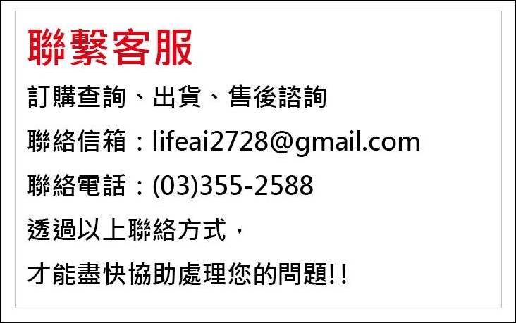 ☑任何下單問題及匯款確認等聯絡事宜,可洽客服信箱:lifeai2728@gmail.com或來電(03)355-2588