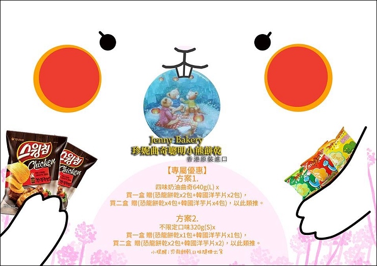 方案1.購買四味奶油曲奇640g(L)x一盒 贈(恐龍餅乾x2包+韓國洋芋片x2包,市值158元),買二盒 贈(恐龍餅乾x4包+韓國洋芋片x4包),以此類推。