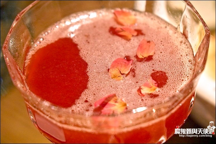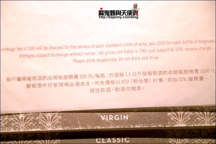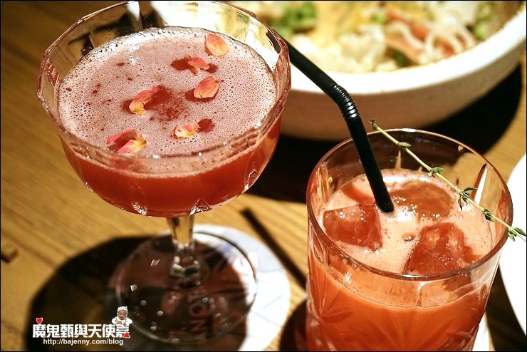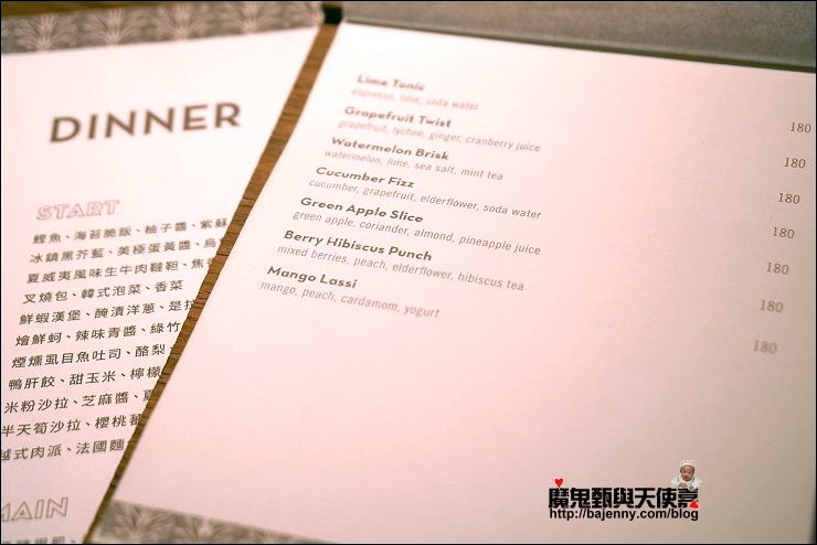 既然以餐酒館的型態,餐前來一杯是必須的!這裡的伺酒師是一位很帥氣的女生,很會介紹,可惜本人不會喝酒,只能很弱的點無酒精的VIRGIN來乾,這杯Mango Lass(180元)i好好喝,為新鮮的愛文芒果與優酪乳去調配,因為芒果產量有限,一天限量沒幾杯,還好這天約一開店的六點吃飯,有搶到名額,嘿嘿!