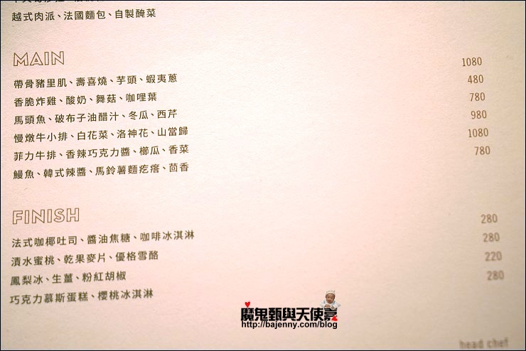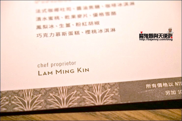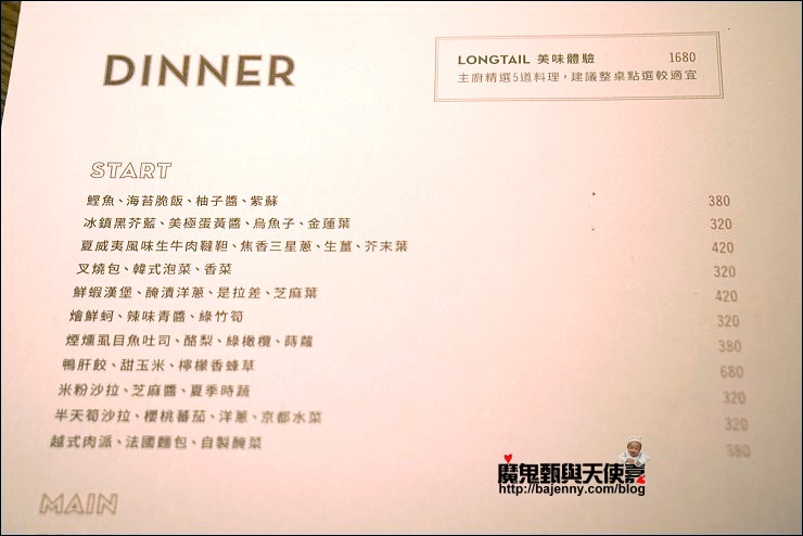 原本訂位的姐妹知道我不喜歡吃西餐,一度想更換餐廳,但本人一聽到是型男主廚Chef Kin的最新力作連忙應好!要知道我想念國賓ACHOI已經很久了(殘念已歇業),好在LONGTAIL延續了ACHOI的美味,用餐環境又更有情調,價位感覺比ACHOI略高一些,也有晚間套餐選項,一個人1,680元(不含飲料),由主廚幫忙配菜,約有6~7道菜,不過要整桌都點才行。