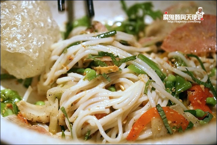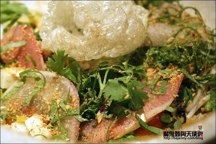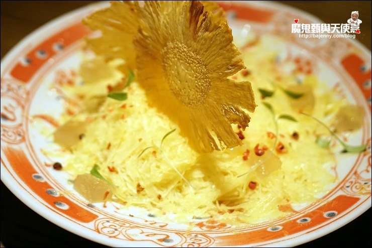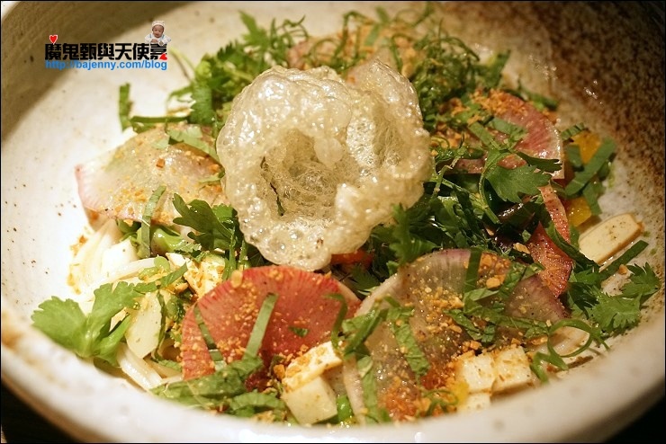 Kin的前菜一直是亮點,有一道價位甚至直逼主食,但活到這把年紀了,我們現在出門只在乎好不好吃,點餐的時候價位已經都拋諸腦後了,反正久久才出門吃一次飯。服務人員推薦這道米粉沙拉(320元),採用夏季蔬果扮芝麻醬,清爽開胃,最上面那片是炸豬皮。