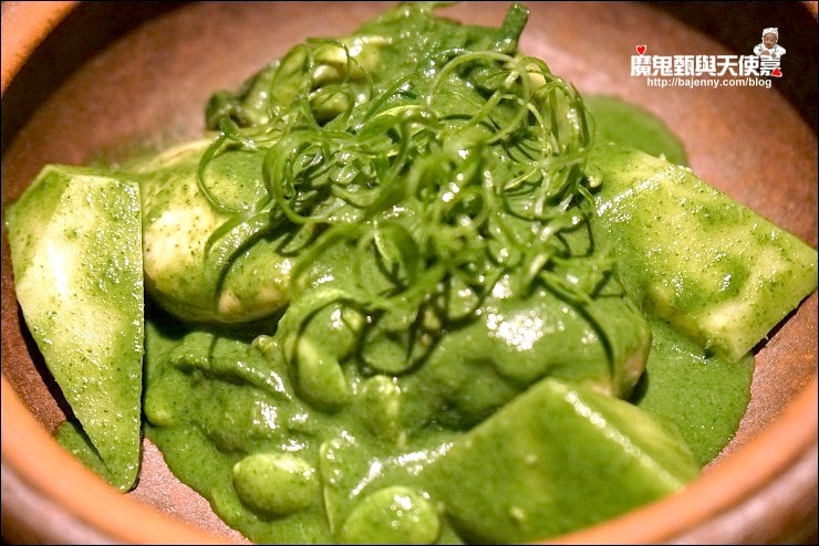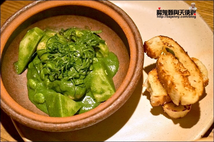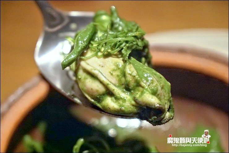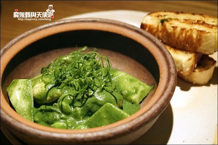就說他的前菜都不簡單,我們一口氣點了五道,先來介紹這道台味十足的燴鮮蚵(320元),裡面除了兩顆大鮮蚵還有綠竹筍跟辣味青醬,一旁的麵包可以拿來沾醬汁吃,這道好吃是好吃,但鮮蚵很難分食啊,三人以上不建議點這道,會有人遺憾(強烈暗示我沒吃到XD)。