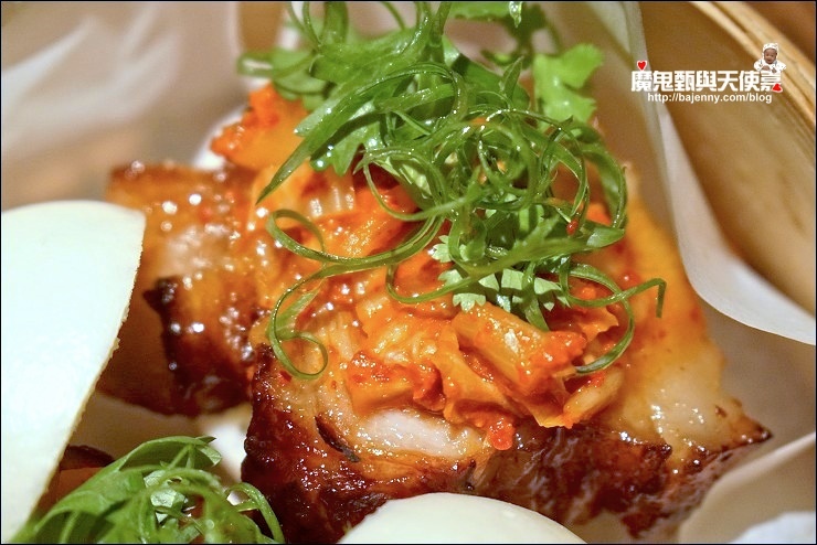 叉燒包(320元)一籠有兩個,上面的特製迷你皮口感很好,中間的叉燒一般是用豬背肉,服務人員說他們特別選用更肥美的腹肉,抹上蜂蜜、蠔油醃製,加上韓式泡菜及香菜的提味,我覺得一個人吃一個根本不夠!但還是要留給別人探聽,當場跟好姐妹一人分食一個(好委屈)...