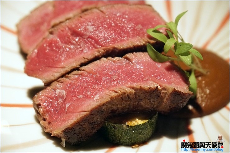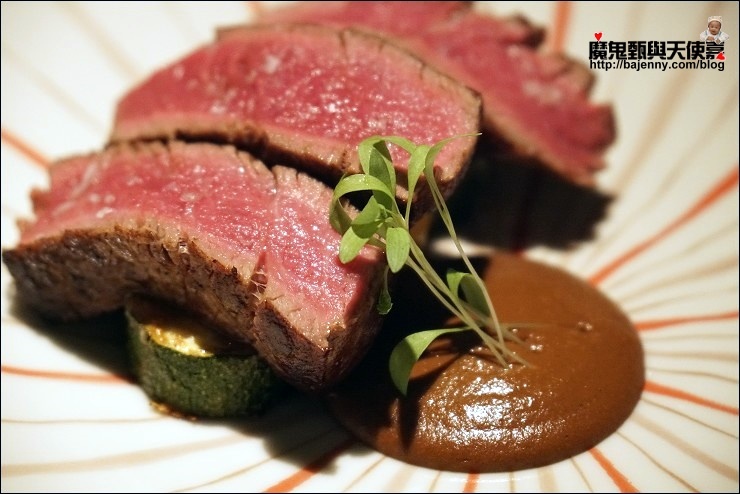 因為前菜瘋狂點,我們主食有節制的點了兩道,一個是最貴的菲力牛排(1,080元),下面鋪了好吃的櫛瓜,旁邊的香辣巧克力醬更是一絕,係以70%黑巧克力跟墨西哥辣醬調和而成,味道是鹹的好搭牛排!牛排熟度控制的剛剛好,外微酥內嫩帶甜,大愛!
