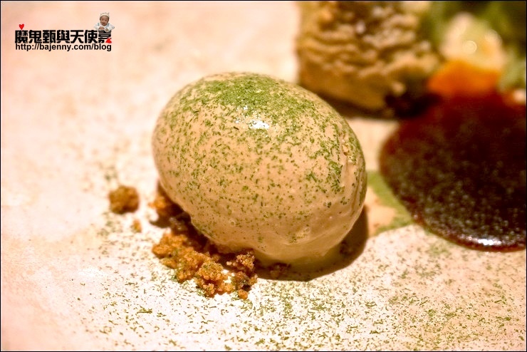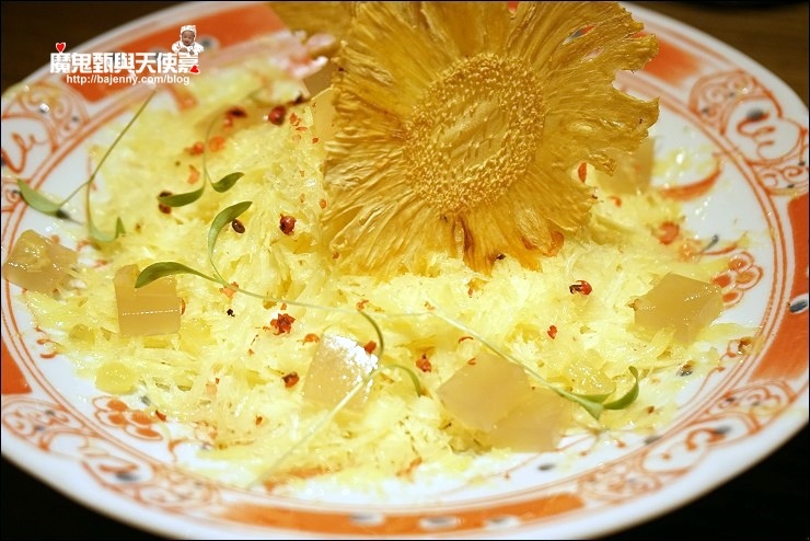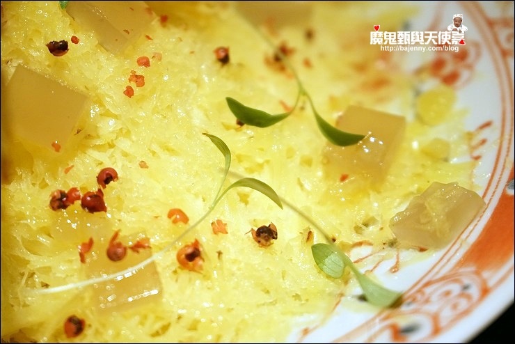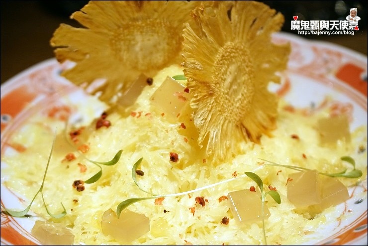 除了兩片風乾鳳梨,提升口感與層次在於點綴其中的生薑果凍跟粉紅胡椒,與涼爽解渴的鳳梨冰激燙出不一樣的火花。