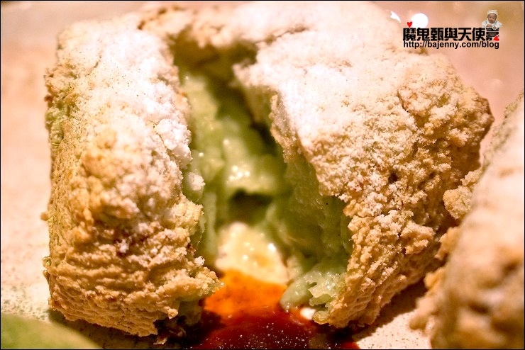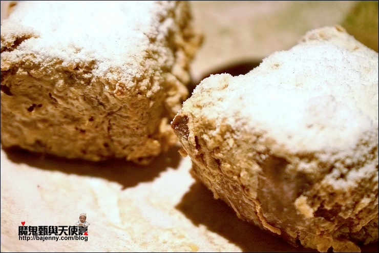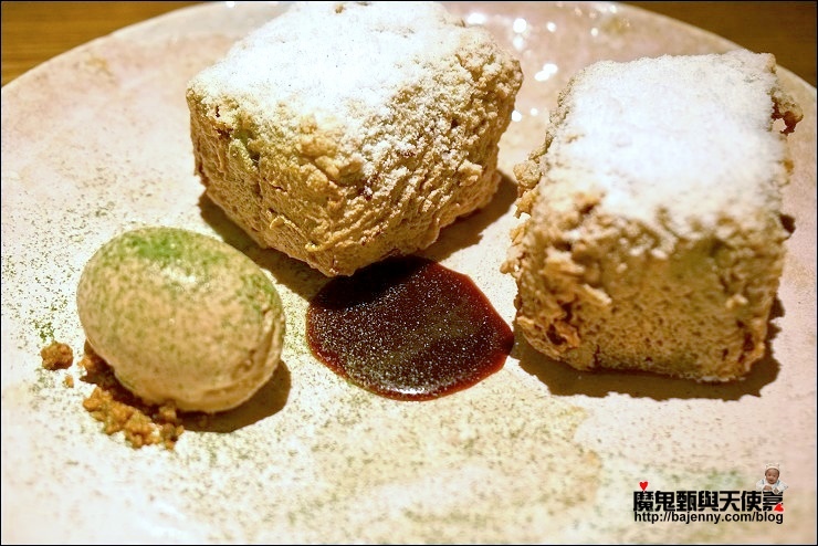 一切開好像熔岩蛋糕般的傾瀉而下,內餡是斑蘭葉與椰奶,口感柔嫩有如蛋糕布丁,尤其配上特調的醬油焦糖與咖啡冰淇淋簡直絕配,大伙直呼好吃!!