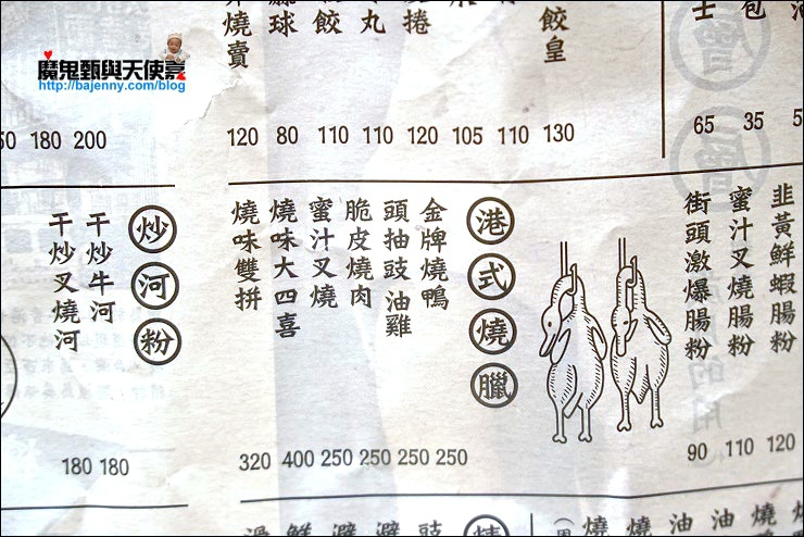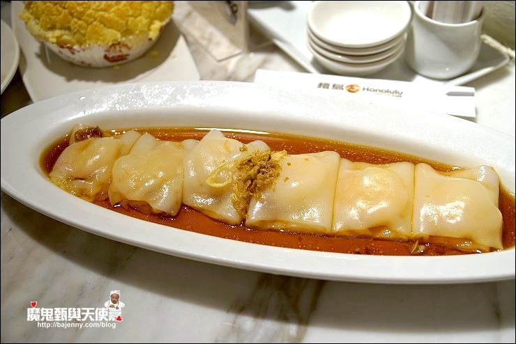 這裡腸粉共有三款,韭黃鮮蝦、蜜汁叉燒跟街頭激爆,最後一個是香港路邊攤小吃最常見的、純淋醬裡面沒包餡料的腸粉,在蒸好的腸粉淋上甜醬、醬油、芝麻醬,如果不喜歡芝麻醬的人,千萬別點這個,我們點韭黃鮮蝦,表現算普通,沒有留下什麼深刻的印象。