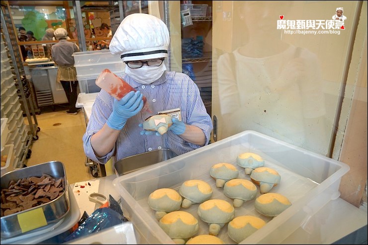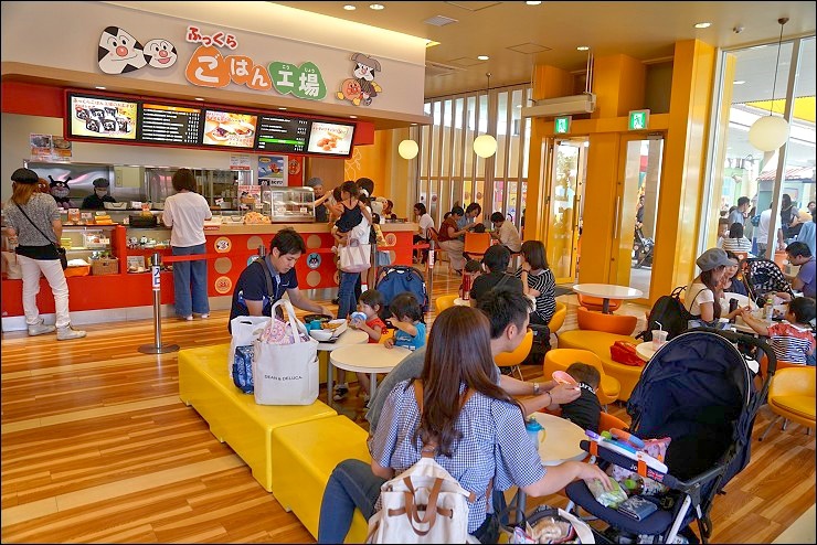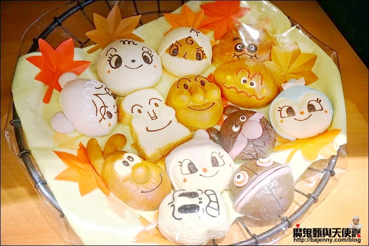 隔壁就是麵包店,旁邊有個休息區,很多人買完麵包就在這邊享用,來到麵包超人飽最不能錯過就是各式各樣可愛的人物造型麵包啊,我們買了四個剛好裝一盒,其中妹妹最愛的藍精靈內餡是香蕉奶油,萬聖節限定的麵包超人是南瓜餡,應該是巧克力口味的細菌人我沒吃到,倒是夾了紅豆餡的吐司超人絕對是第一名,口感帶點酥脆,好好吃!大家絕對不要漏買這味!