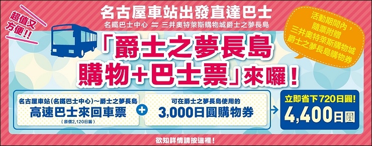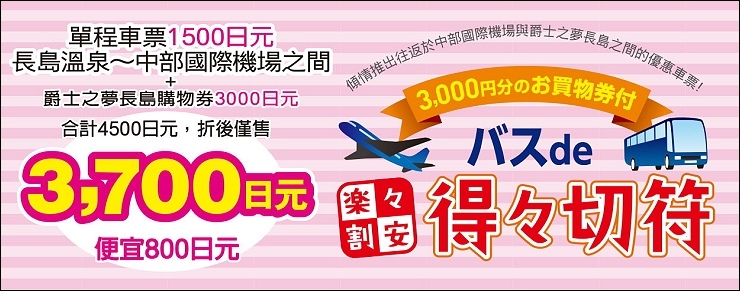 純粹買來回票的話是成人1,900日圓、兒童960日圓,比單程來的划算(成人1,060日圓、兒童530日圓),乘車地點在名鐵巴士中心四樓22號上車,在終點站「長島溫泉」下車後即可抵達,車程約50分鐘。現有推出很優惠的組合套票,不論從機場或是名古屋車站出發都可以,名古屋車站往返OUTLET加一張3,000日圓購物券是4,400日圓(省下720日圓),中部國際機場至OUTLET單程+3,000日圓購物券=3,700日圓(省800日圓),有打算來買東西的朋友,不用擔心購物券花不掉,因為真的很好買,當然要買套票的啊~~