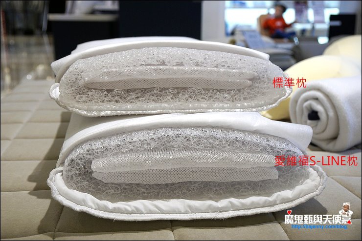 床挑好了,也得挑顆適合的枕頭,每個人的頸部曲線不同,選擇枕頭高低也會有所差異。最近我睡覺連枕頭都沒躺,其實這樣是不對的,長期下來對頭部頸部都不好。愛維福的標準枕與S-LINE枕都是3D立體方式纏繞樹脂纖維層層包覆,中間二層可以獨立抽出調整高度,高彈力材質給頭部更好的支撐力,超透氣,還可水洗。愛維福S-LINE枕比較大一點,枕頭的兩側比中央硬,對習慣側睡的朋友可以有較好的側睡支撐。