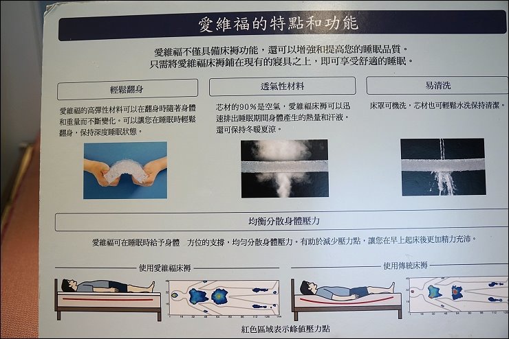 愛維福薄墊有四大特點,輕鬆翻身、高透氣性、可水洗及均衡分散身體壓力。透氣性帶來的涼感在試躺時就能直接感受,要知道晚上睡覺時體溫會升高,晚上常熱醒除了天氣熱,跟床與枕頭的透氣度也有很大的關係,愛維福產品芯材90%是空氣,可以迅速排出身體的熱氣跟汗,身體自然舒服一夜好眠。輕鬆翻身與均衡分散身體壓力的二大特色,能讓身體肌肉硬綁綁的運動員睡的好,多國奧運指定就是強力認識啦!不過,自己的床自己選,買床絕對要讓身體自己選,試躺去!