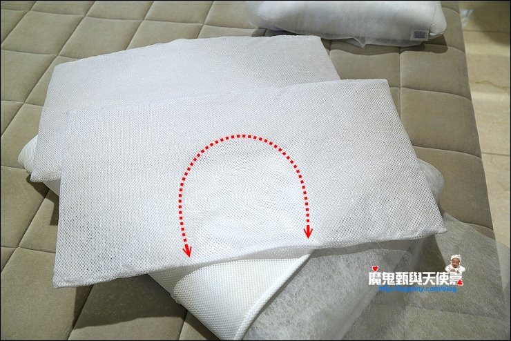 標準枕中間可抽取二片枕心,其中一片有有頭部凹槽設計,正躺時頭部剛好固定在這裡,很符合人體工學。我自己本身習慣側睡,所以S-LINE枕兩側有加硬支撐更適合我,中間二層平面層抽出來,用家裡的枕頭套裝起來,剛好可以給阿弟當枕頭,買一顆變二顆,母子都有透氣舒適好枕頭啦,阿弟睡覺超會流汗,尤其是那顆頭,每次半夜都得幫他擦汗,枕頭都睡的好臭好難清潔,愛維福的枕頭透氣又舒服還可以水洗,實在是太方便啦。