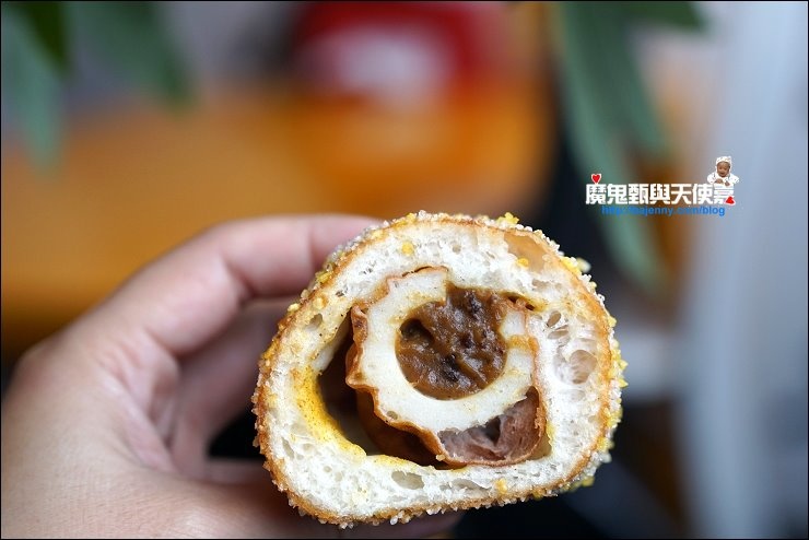 這間age bunbun是最近地區人氣麵包結合串炸,剛出爐熱騰騰的麵包好香好迷人呀,日本人很愛的紅豆麵包,甜甜的紅豆泥配上Q彈的麻糬,口感極好,麵包外層粒粒分明的麵包粉帶著酥脆的口感,同行友人默默再去外帶一顆。人氣咖哩麵包是我愛的鹹口味,厲害的是裡頭還包竹輪,吃的到海鮮的味道,我喜歡。