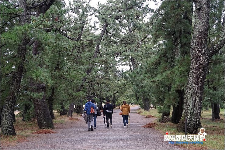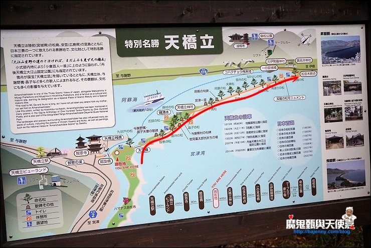 日本三景之一的天橋立,這裡是非常特殊的自然景觀,因為地殼的推擠作用,在海上形成一個沙洲地形,全長3.6公里的白色沙灘與綠油油的松樹,我們很悠閒的走在林間裡,也有情侶好浪漫在海邊手牽手散步。可惜因為這天天氣不好風太大,天橋立展望台關閉不開放...人家說在這裡看天橋主有很經點的動作,就是要北對沙洲,彎下腰從自己跨下往後看,會看到沙洲像是一條通往天上延伸的橋樑,有機會一定要來看!