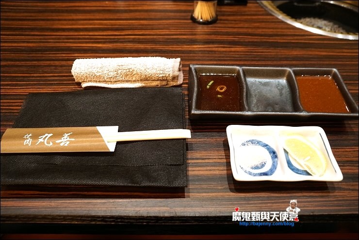 入座時桌上已擺好餐具及醬料,連圍兜兜都貼心準備,免得烤肉時噴到衣服。丸善的醬汁很厲害,是使用古方傳統的醬油跟味噌醬汁,甘甜與鹹度搭配的很完美,讓原本就好吃的燒肉更添豐味。