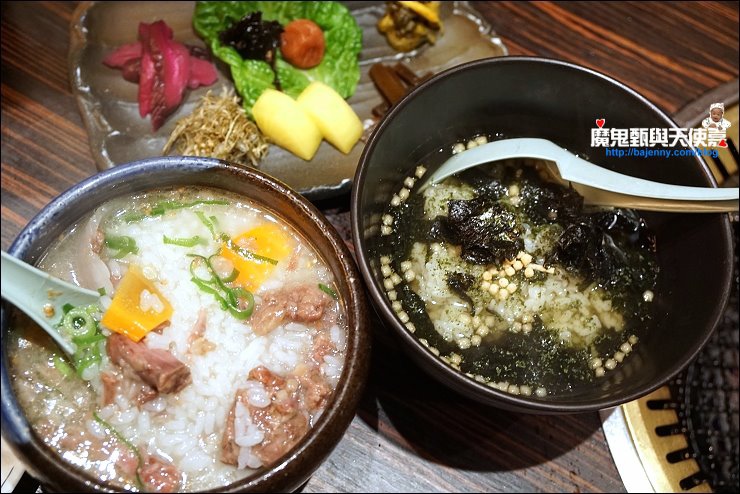 就在我被牛肉牛肝的美味迷到天花亂墜時,竟然還送上讓人飽到滿點的粥及茶泡飯,左邊的牛尾粥湯頭濃郁我很喜歡,不過米飯類真的飽足感太強烈了,建議食量不大的人進攻牛肉才是上策。![]()