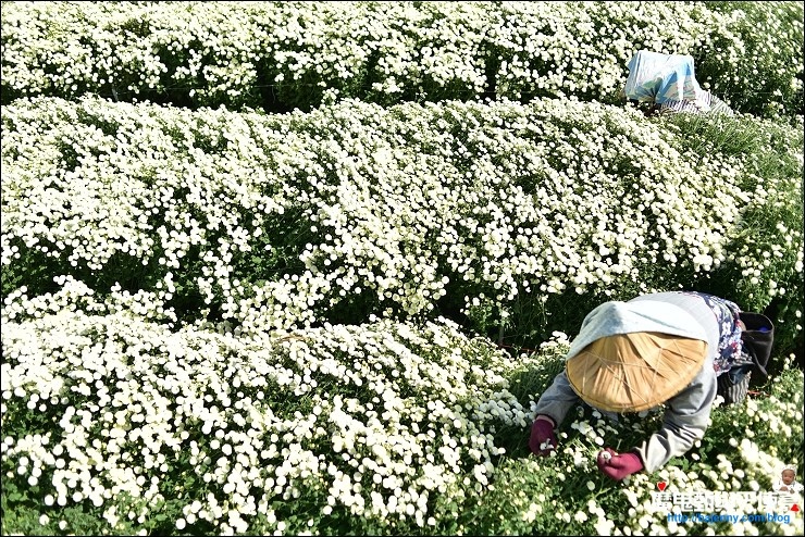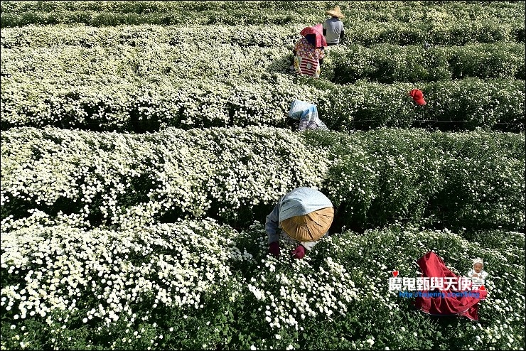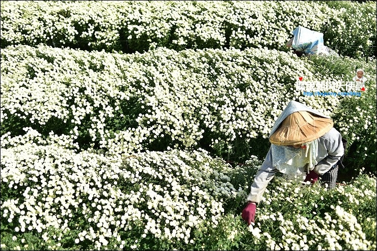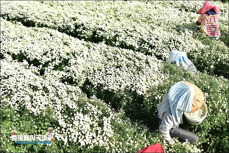 大叔團時間來的巧,碰到採杭菊的農婦辛苦工作中,被掃過去的杭菊花田從白帥帥變成綠油油。