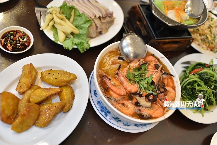 店家無菜單,直接到最後面廚房食材或牆上主廚推薦菜色點菜,這天點了7菜0湯一桌共2300元,蟹黃代子、櫻花蝦炒飯、鮮蝦麵線、鵝肉和拔絲地瓜都好吃。