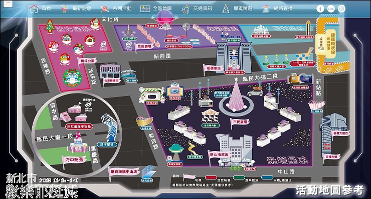 大型燈飾:新北市政府前廣場(主燈區)、萬坪公園(PORORO)、板橋車站前站前廣場(全新燈區)