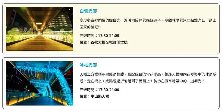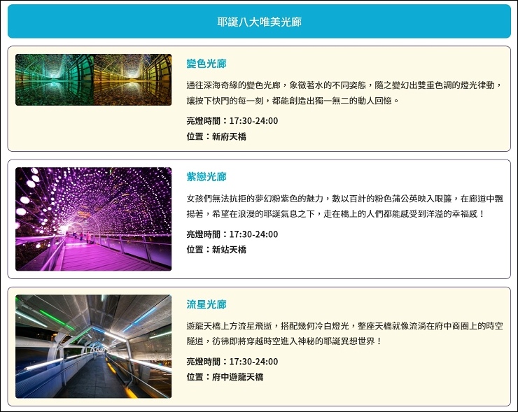 耶誕四大夢幻天橋點燈時間和位置如下,基本上看到連通道就走上去晃一下就對啦~~