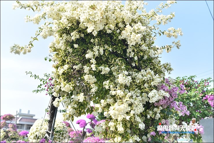 走進後半段才發現遊客都集中在這兒,這裡的九重葛比較年輕,比較沒有修枝造型,不過反而比較集中好拍,基本上看網美IG打卡照就知道怎麼取景怎麼拍啦!