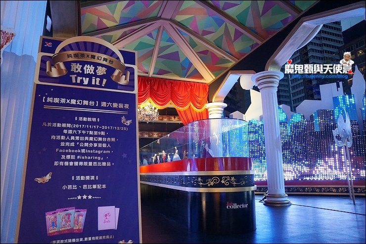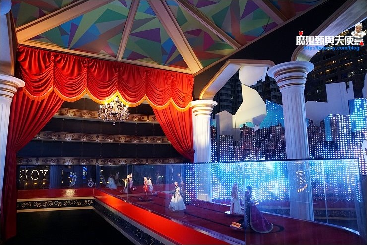 走進魔幻舞台紅色伸展台呈現出芭比們在百老匯劇院的經典走秀,背景為劇院裡的觀眾席,好像觀眾進場看芭比走秀!天花板也很有戲,靈感來自彩繪玻璃,加上七彩炫麗的打燈,讓舞台充滿神秘又華麗的色彩。