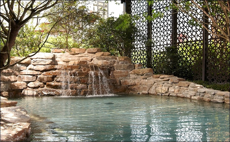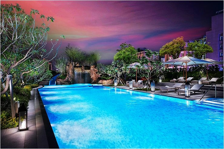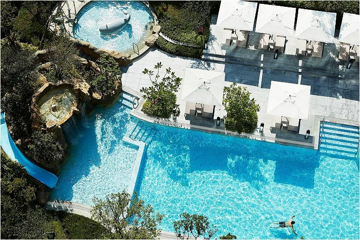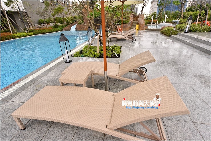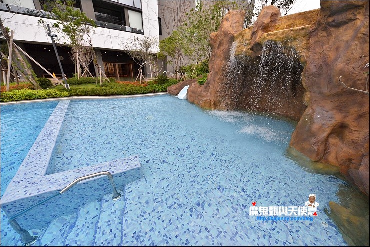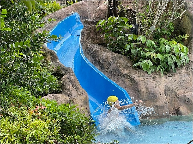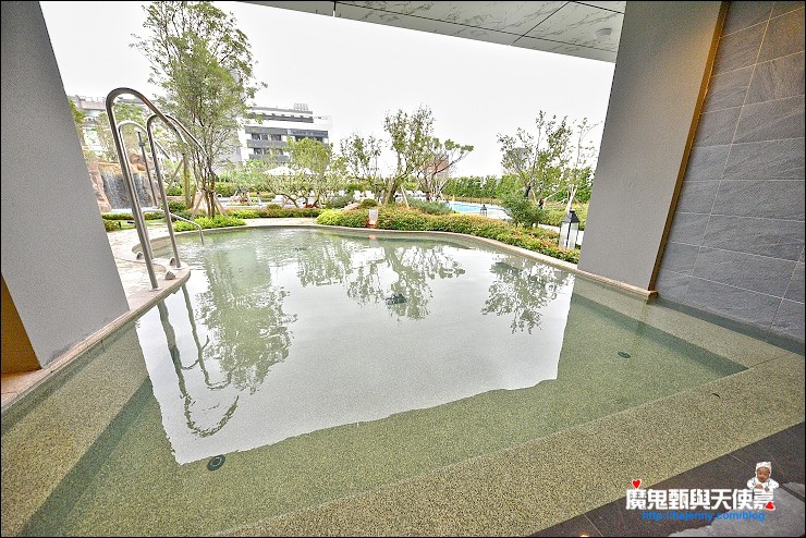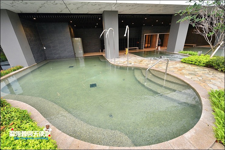 戶外溫泉游泳池有造景和水中溜滑梯,這個在大溪威斯汀也有看過,不過寒沐酒店的水中溜滑梯是直接溜近溫泉游泳池裡,連冬天也可以溜。