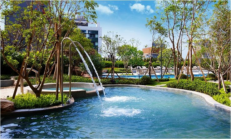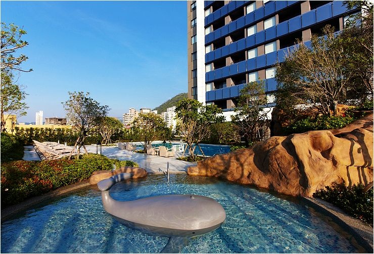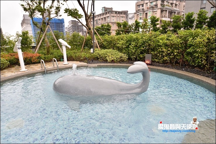 戶外溫泉游泳池旁還有個隱藏版的鯨魚擺尾噴泉小池,感覺很適合小小孩。