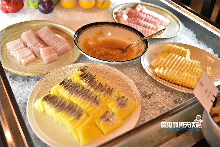 現切肉片、清蒸肉圓、燒賣饅頭、生魚片和宜蘭鴨賞等涼拌小菜。(提醒大家!此為入住時實拍,實際菜色飯店是依季節食材提供。)