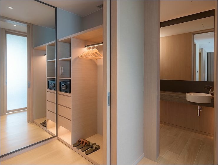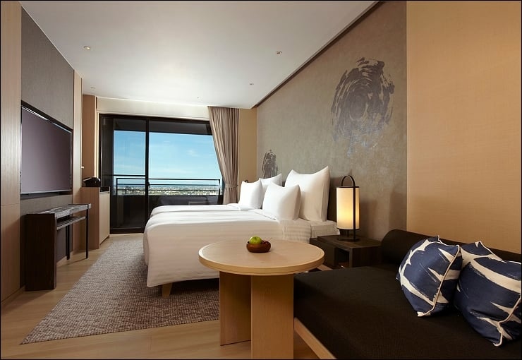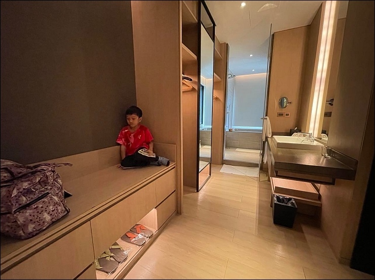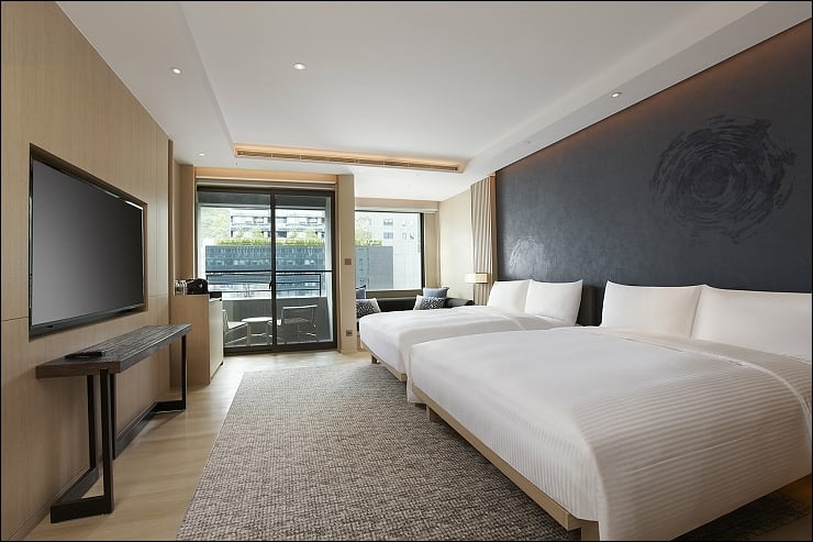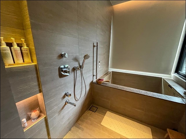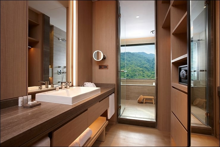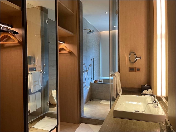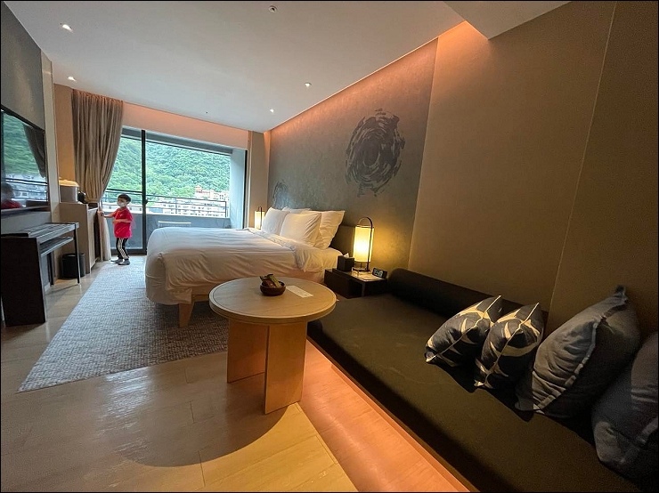 礁溪寒沐酒店房型分成語木居、乘風居、迎曦閣和寒沐苑(總統套房)。語木居是沒有陽台只有二小床的基本房型,上圖是有露台茶几的乘風居,可拆可併可加沙發床,很適合小家庭入住。房間也不小,隔局設計很不錯,茶几、沙發、露台景觀一片綠意,有雙床或大床房型;免治馬桶不用自己掀馬桶蓋就是高級!衣物間雙邊設計有夠大,再往內走,沐浴間還可以泡湯,欣賞風景好Chill。小姑家二大一小入住,空間很夠用!