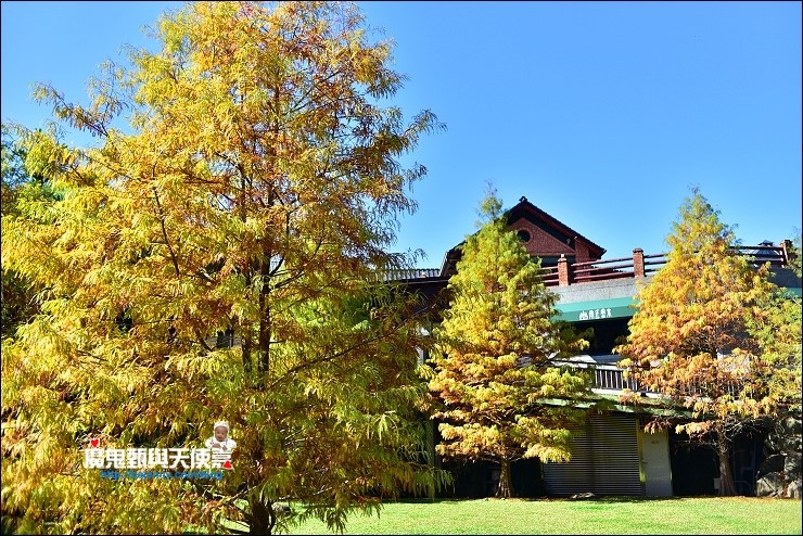 餐廳後面就是人稱小型雲山水的落羽松森林,前有水池造景,後有藍天白雲和綠油油的山景。