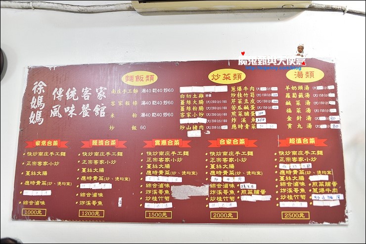 徐媽媽客家小吃的價位經濟實惠,裡面以在地客居多,觀光客偏少,現炒菜色100元起跳,炒南庄手工麵好吃必點,滷味拼盤便宜、炒青菜等其他菜色口味也都不錯,記得不要點太多啊~~